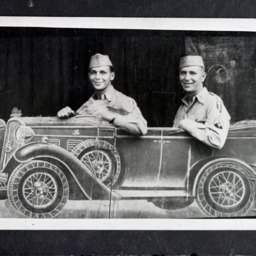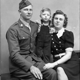 Photo of two separate photographs of an unidentified young man a a U.S. Army uniform seated beside an older unidentified man, probably his father. An unidentified older woman, probably his mother, is standing behind both of them.