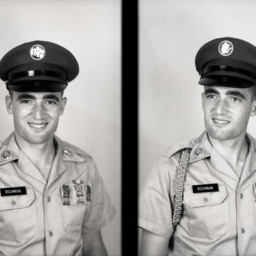 Photo of two separate portrait photographs of Gary Richard Bauserman in his U.S. Army uniform and cap.