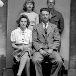 Unidentified older man and woman are seated together with an unidentified man in an Army uniform beside them. Three additional unidentified adult women are standing behind them.