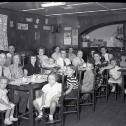 Identified are: Dr. Stoneburner (2nd from the right) who was an optometrist, and his wife, Mrs. Stoneburner, (standing, far right) who played the organ.