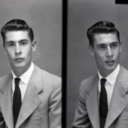Photo of two separate portrait photographs of "Jeep" Stoneburner as a young man in a suit and tie.