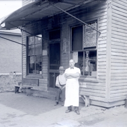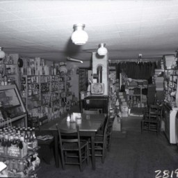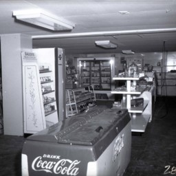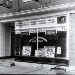 Signs on the front of the business advertise cigars, cigarettes, greeting cards, gifts, novelties, candy and a…