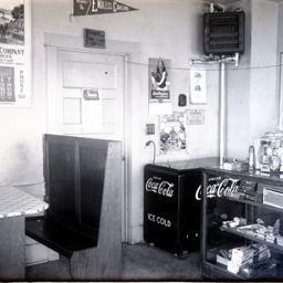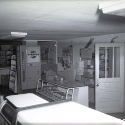 A soft drink vending machine with a "Pepsi" advertisement on it is visible as are numerous shelves with goods on display. An open door leading to the parking lot is also there.