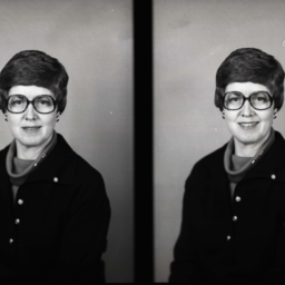 Photo of two separate portrait photographs of Carolyn Faith (Stultz) Derflinger with short hair and glasses.