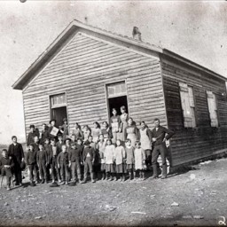 Photograph of an unidentified school building with a group of unidentified students posed in front of it.