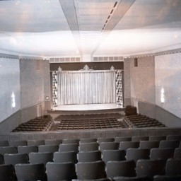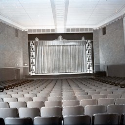 Rows of seating are in the foreground and the curtained stage is in the back of the image.