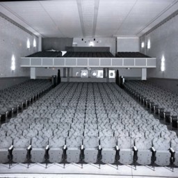 Rows of wooden seats are in the foreground with a stage visible at the back.
