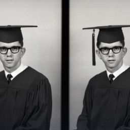 Photo of two separate portrait photographs of Dennis Thomas as a young man with glasses wearing his graduation cap and gown.