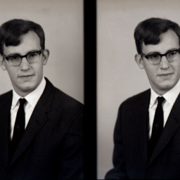 Photo of two separate portrait photographs of Kenneth Thomas as a young man with glasses and wearing a suit and tie.