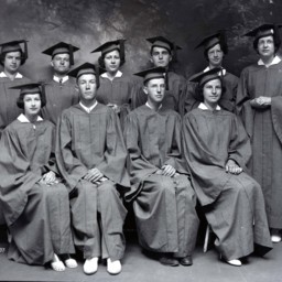 Group of ten unidentified students posed together in two rows, all wearing their graduation caps and gowns.
