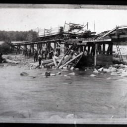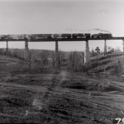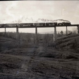Photographic card bearing an image of a steam locomotive and cars on the Narrow Passage Railroad Trestle located between Edinburg and Woodstock Virginia.
