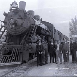 Identified are (l to r): Larry Mundy, conductor; C.R. Wetsel, extra fireman; E. Garvin, engineer; Harold Mauney, train master; Charles Chandler, agent; Omar Evans,…