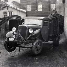 Photograph of an early Chevrolet truck with tall, wooden stock racks for a bed is shown in an alley.