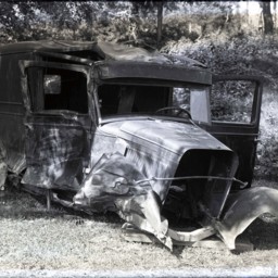 Photograph of a wrecked, upside-down, pickup truck lying in a field beside a road. There is a State Police vehicle parked on the road and several unidentified bystanders are visible.