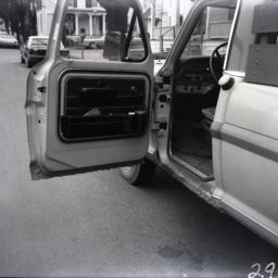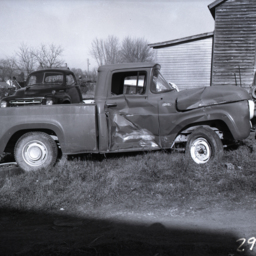 Side view of a Ford pickup truck parked outdoors and showing significant damage to the passenger side door and front tire/fender area.