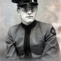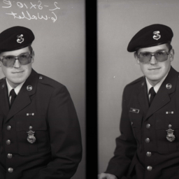 Photo of two separate portrait photographs of a cadet named "Murphy" with glasses, and wearing his military school's uniform.