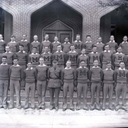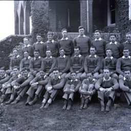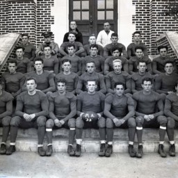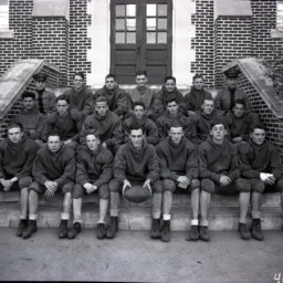 Unidentified members of the 1933 Massanutten Military Academy (MMA) football team posed on the steps of a campus building.