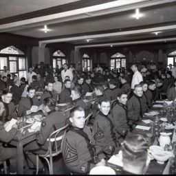 Photograph of unidentified cadets from Massanutten Military Academy (MMA) seated at long tables and having a meal in the school's dining hall.
