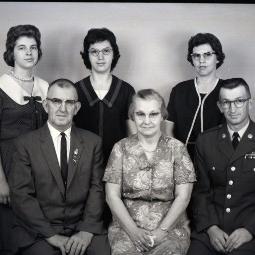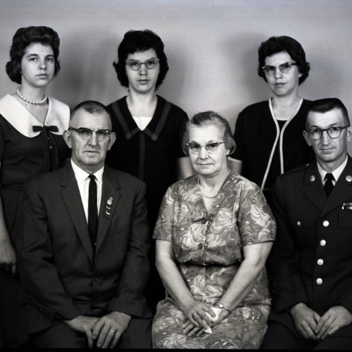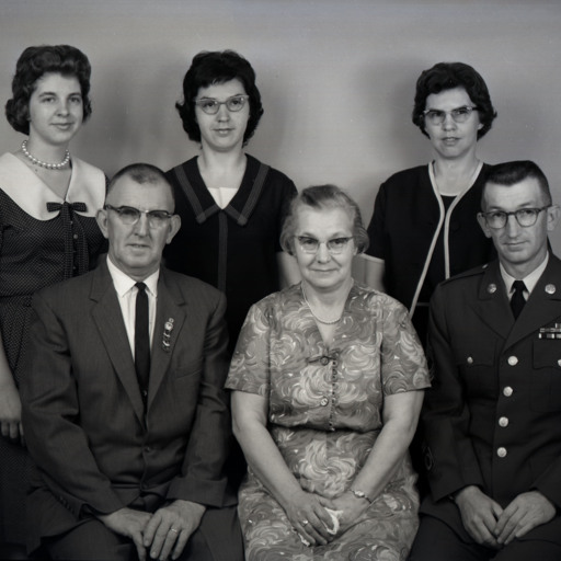 Unidentified older man and woman are seated together with an unidentified man in an Army uniform beside them. Three additional unidentified adult women are standing behind them.