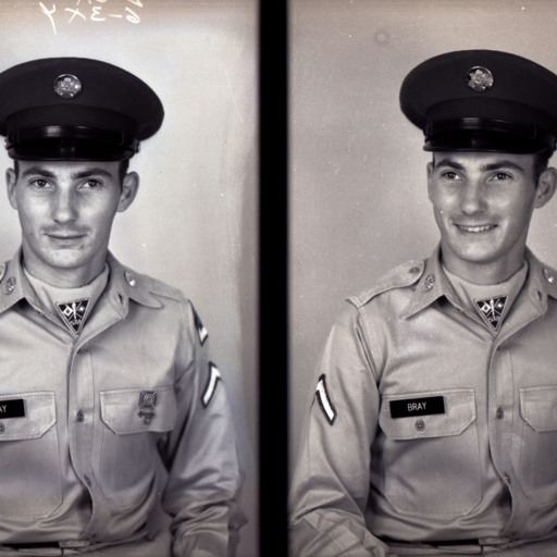Photo of two separate portrait photographs of a young Army soldier with a name tag that reads, "Bray".