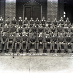 Group of twenty-six unidentified cadets from Massanutten Military Academy (MMA) posed in three rows in front of Lantz Hall.