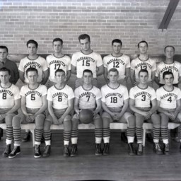 Group of unidentified cadet members of the basketball team at Massanutten Military Academy (MMA) shown in two rows wearing their uniforms.