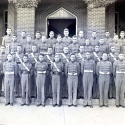 Group of unidentified cadets from Massanutten Military Academy (MMA) posed in rows on the steps of Lantz Hall.