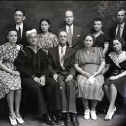 Unidentified older man and woman are seated with five unidentified young men and women of varying ages posed around them.