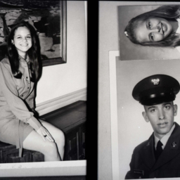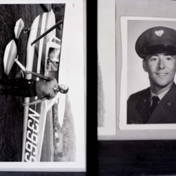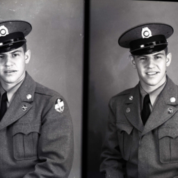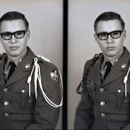 Photo of two separate portrait photographs of a young man with glasses wearing a military uniform with a patch on the shoulder indicating he was a member of the Army ROTC.