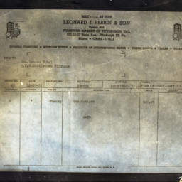 Photograph of the receipt issued on December 20, 1951 from the Leonard J. Perrin & Son Furniture Market of Pittsburgh, Pennsylvania, to Louise Vitol of rural Middletown, Virginia.