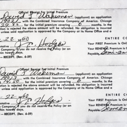 Photograph of two separate payment receipts, from December 1960, given to David L. Wakeman. One was for $29.85 and the other was for $14.50.