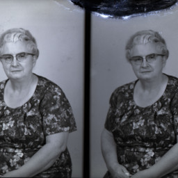 Photo of two separate portrait photographs of Erma P. Tysinger with glasses and shown in her later years.