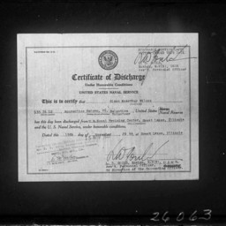 Photograph of the document certifying that Apprentice Seaman Glenn McArthur Wilcox was honorably discharged from the Navy in Great Lakes, Illinois, on November 15, 1944.