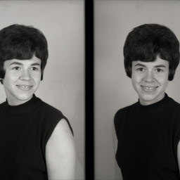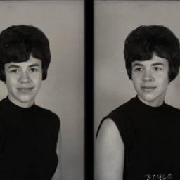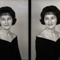 Photo of two separate portrait photographs of Sue Ellen (Wilkins) Windle as a young woman with short hair and wearing a sleeveless top.
