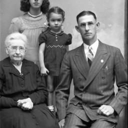 Louise Virginia (Crabill) Wisman (seated on left), her son, Clarence Luther Wisman (seated on right), her grand daughter, standing on the left, Louise Virginia (Wisman) Carter, and her great…