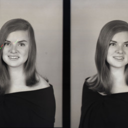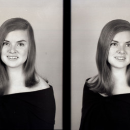 Photo of two separate portrait photographs of Sandra Kay (Wolverton) White as a young woman with shoulder-length, straight hair.