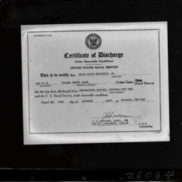 Photograph of the document certifying that Seaman First Class Garrett David Wolverton was honorably discharged from the Navy in Bainbridge, Maryland, on January 21, 1946.