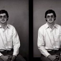 Photo of two separate portrait photographs of Lynn Wolverton as a young man with glasses, a mustache, and a striped shirt.