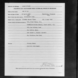 Photograph of a single page from a Notice of Separation packet for an unnamed Firman Second Class who was born in Woodstock, Virginia, on April 13, 1925.