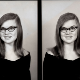 Photo of two separate portrait photographs of Sandra Kay (Wolverton) White as a young woman with straight hair and glasses.