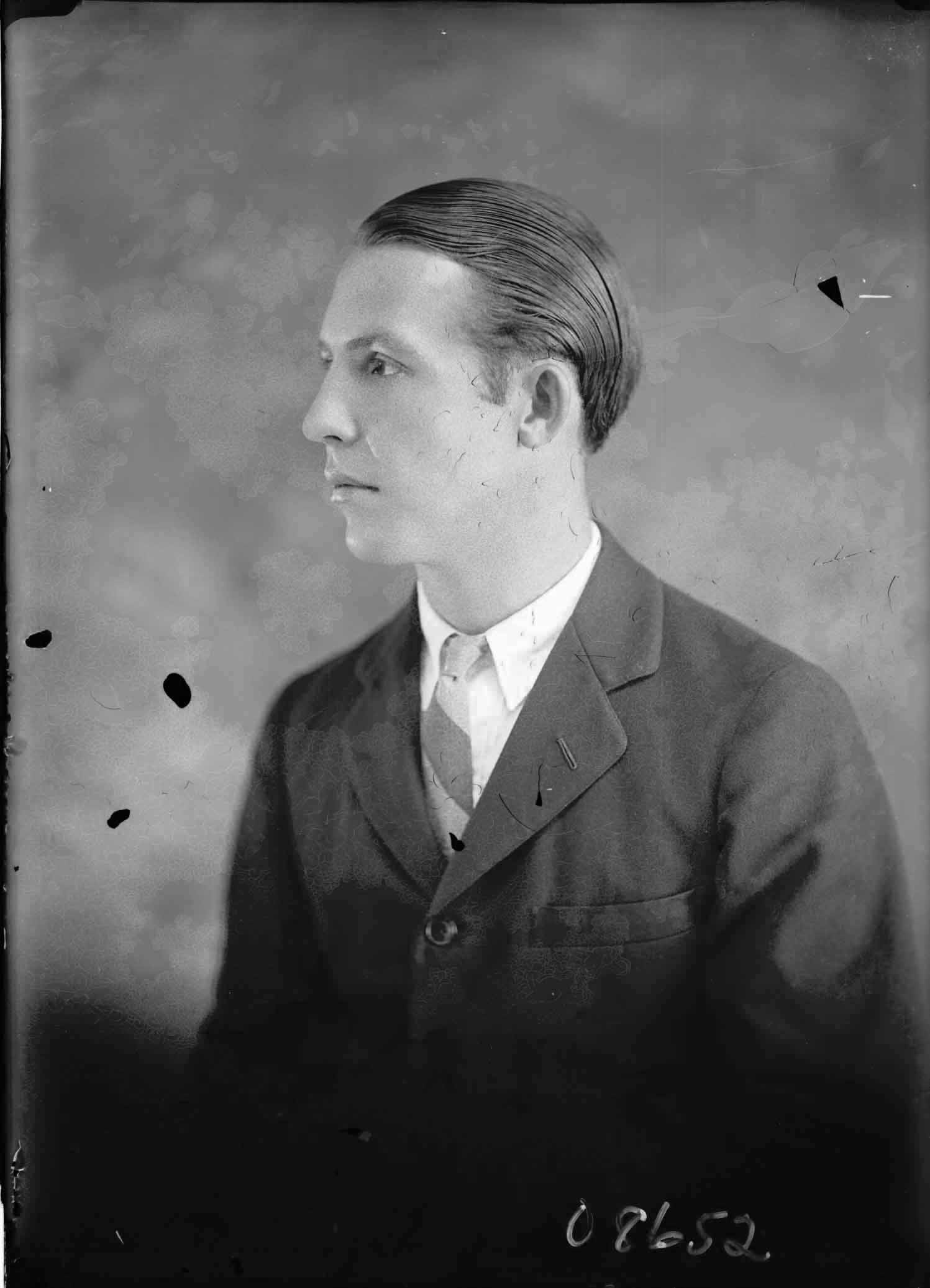 Portrait of an unidentified young man in profile and wearing a suit and tie.