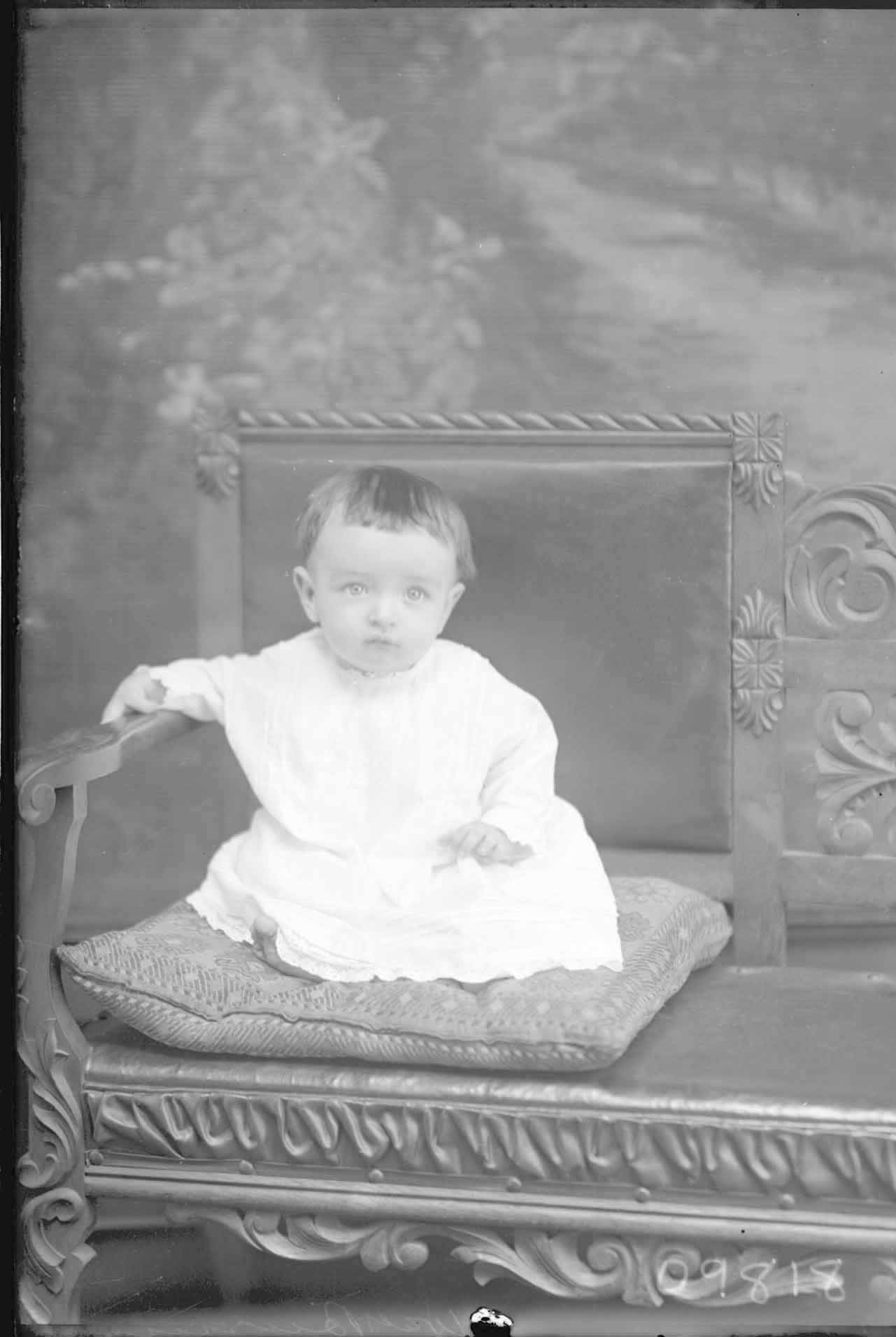 The name, "Burner", is written on the glass negative of this image of an unidentified young child seated on a bench.