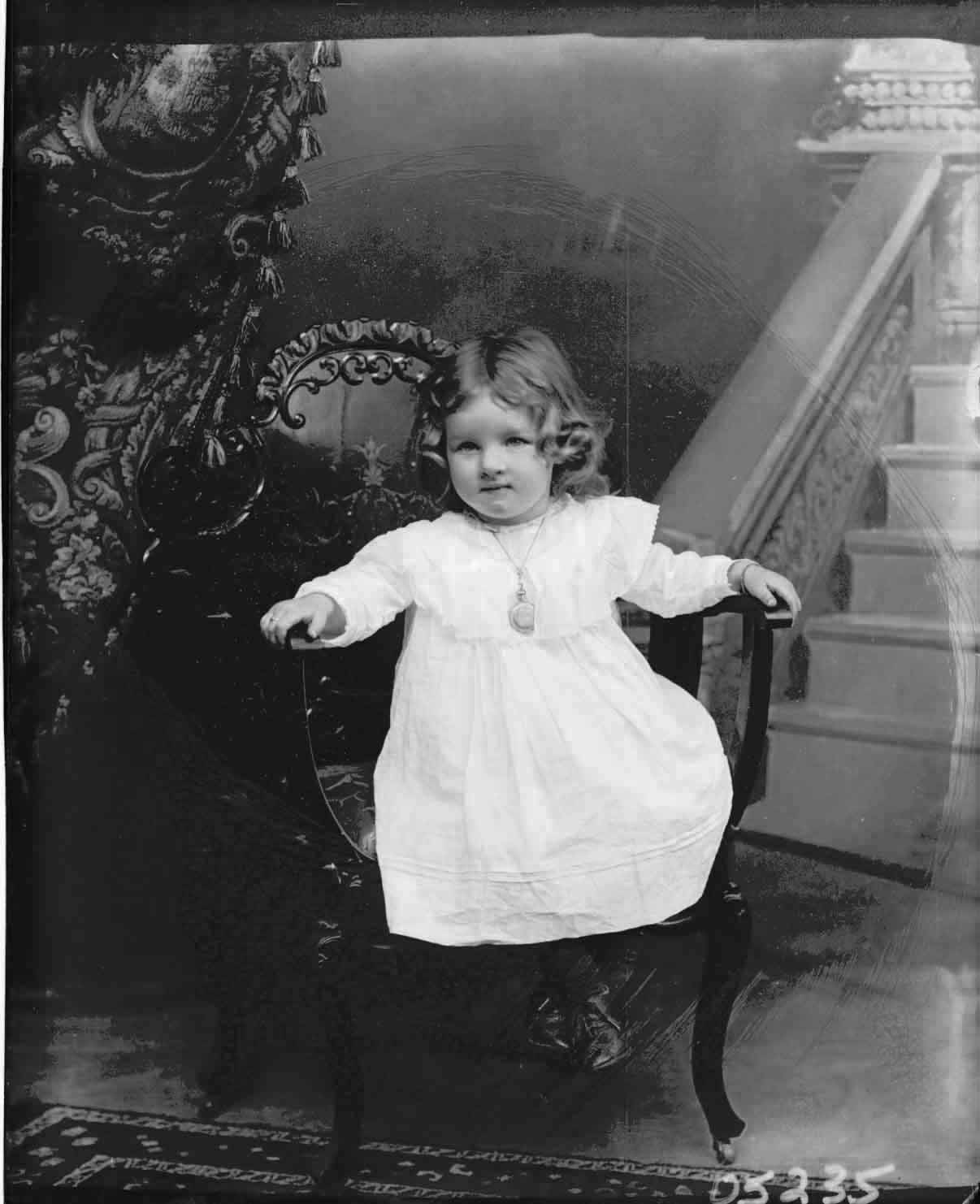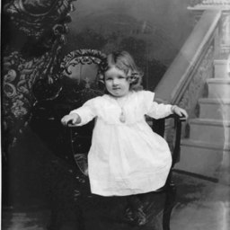 Photograph of an unidentified little girl seated in a studio chair with a backdrop of a staircase behind her.