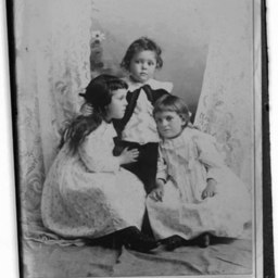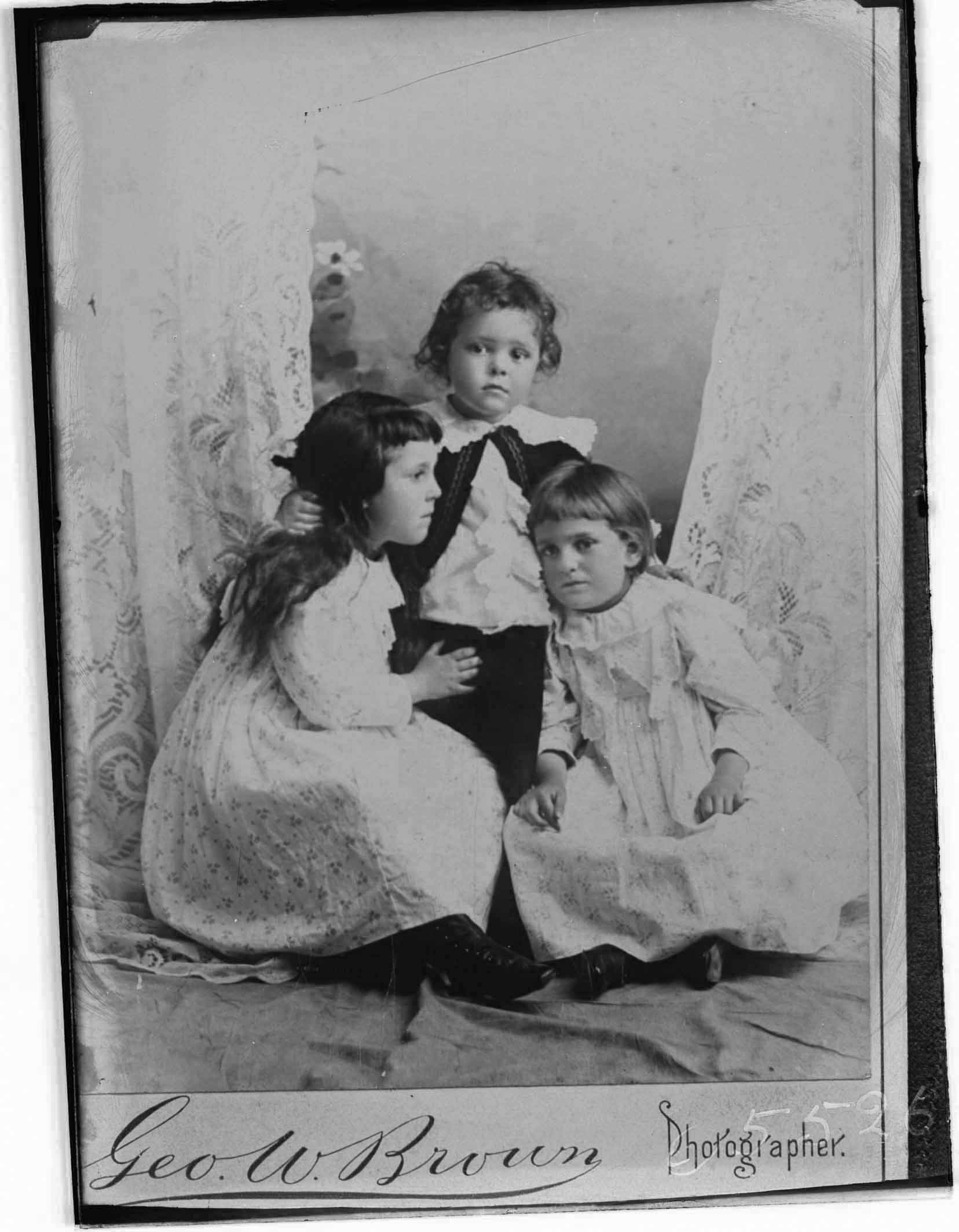 Photo of a postcard of three unidentified children. The original photographer's name is visible on the bottom, "Geo. W. Brown".