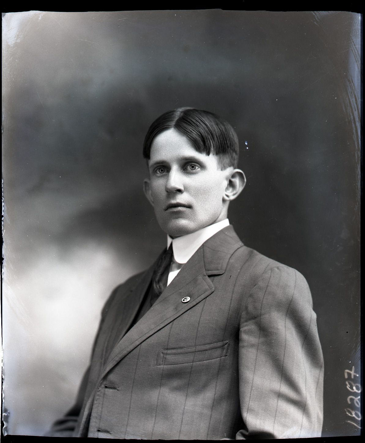 Portrait photograph of an unidentified young man in a striped suit and tie with a starched collar. He has a pin on his lapel.