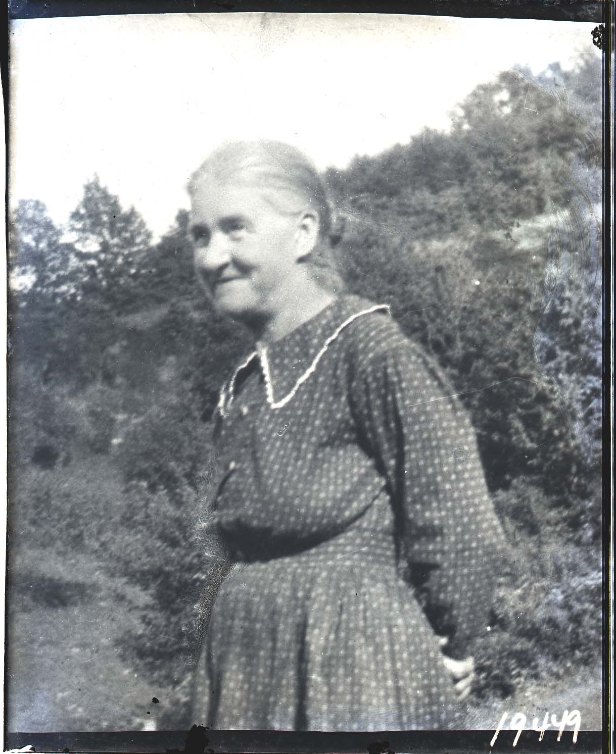 Unidentified older woman with her hair pulled back, is wearing a long-sleeved print dress, and standing outdoors with her hands behind her back.