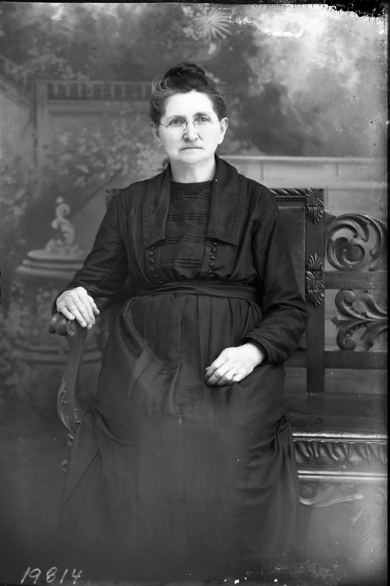 Unidentified older woman with glasses and her hair in a bun, is seated on a bench and wearing a long-sleeved dark dress.,