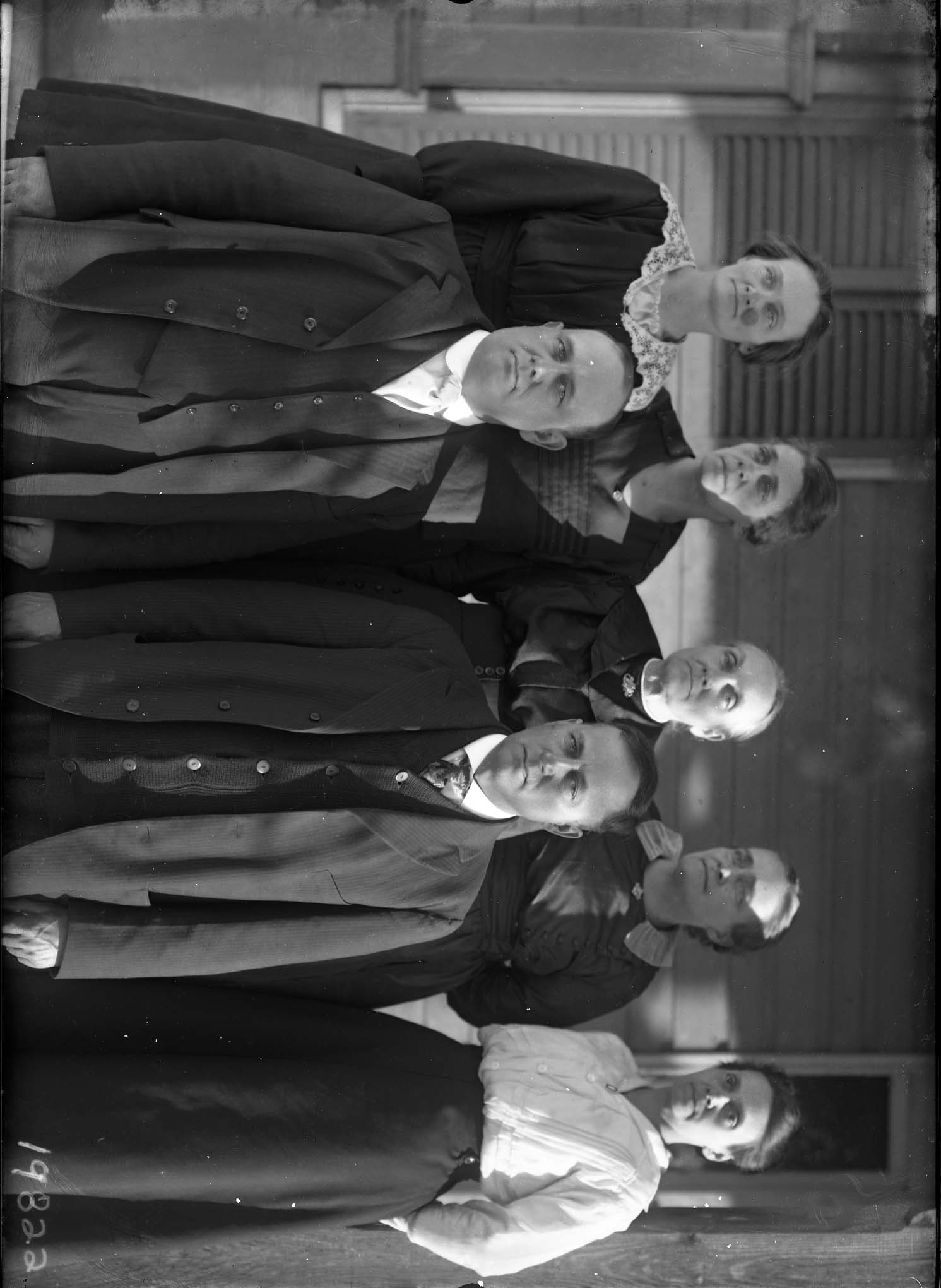 Two unidentified men, both wearing suits and ties, are standing together with five unidentified women standing in a line behind them.