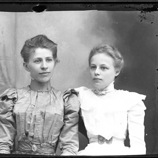 Portrait photograph of two unidentified women, both with their hair pulled back and wearing dresses with high collars.
