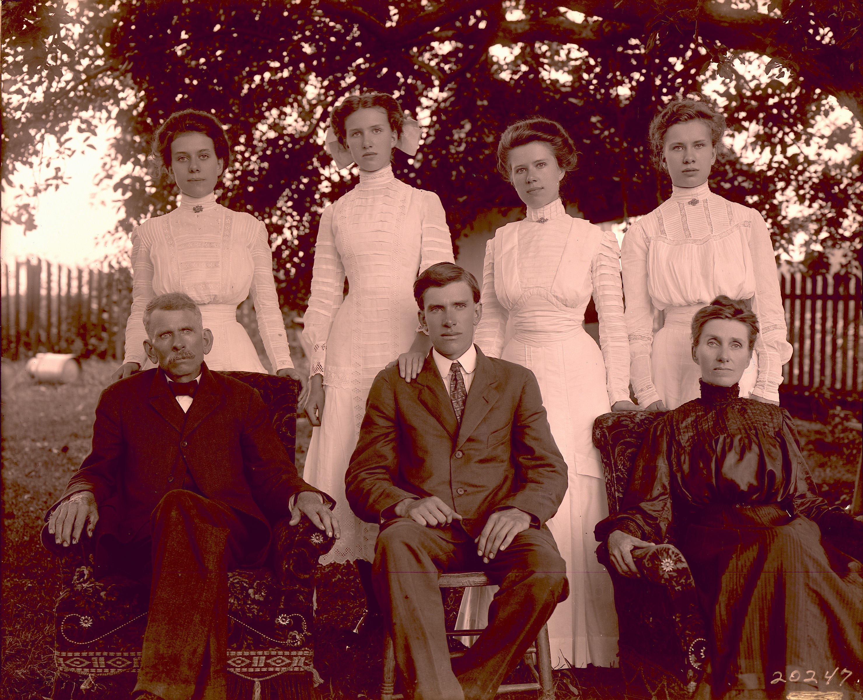 An older man with a mustache and an unidentified woman are seated with a younger man between them and four young women standing behind them.
